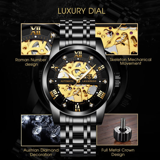 Automatic Watches for Men Self Winding Diamond Skeleton Luxury Dress Mens Watch Sapphire Crystal Tungsten Steel Band Luminous Waterproof Reloj Para Hombre, Gifts for Men